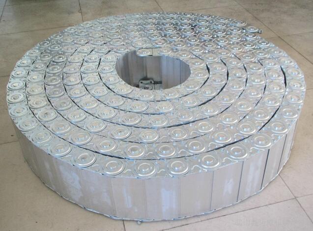 鋼鋁拖鏈的彎曲半徑必須大于內置的管件可彎曲的最大半徑,并留有10%的富余空間,穿線管路較多時應該用隔片分開。