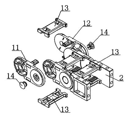 為實現上述目的,本公司提供如下技術方案:一種新型加強型拖鏈,包括鏈節和固定接頭:所述鏈節的數量為若干個,且依次連接:兩端的鏈節均轉動連接固定接頭:所述鏈節包括相同設置的左側主體板和右側主體板以及連接橫桿和警示裝飾國:所述左側主體板設有左連接塊、左通孔、左滑塊、左滑槽和左環形凸臺:所述左滑塊和左滑槽的位置相對應:所述左連接塊設有左凸臺和左加強筋:所述右側主體板同樣設有右連接塊、右通孔、右滑塊、右;骨槽和右環形凸臺以及右凸臺和右加強筋:所述連接橫桿設有定位槽,且數量為兩個:所述左側主體板和右側主體板的上下兩端均通過連接橫桿固定連接:所述左凸臺和右凸臺分別固定在兩個定位槽內:所述左滑塊與另一個相鄰的左側主體板上的滑槽左滑動連接,并通過警示裝飾國固定:所述右滑塊與另一個相鄰的右側主體板上的右滑槽滑動連接,并通過警示裝飾國固定。